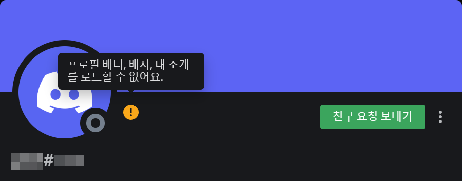 언제부턴가 디스코드 프로필 옆에 노란색 원 안에 느낌표가 있는 아이콘이 뜨기 시작했습니다. 마우스를 올려보면 "프로필 배너, 배지, 내 소개를 로드할 수 없어요." (이전에는 'Unable to load profile banner, badges, and aboout me.')라는 문구가 뜹니다. 이 문구의 의미에 대해 알아봅시다.