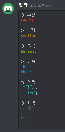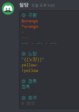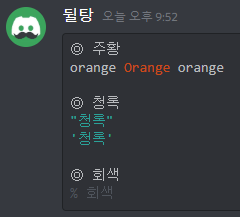 회색회색 (Quote, #4f545c, #c7ccd1) : 주석을 나타낼 때 쓰이는 색입니다. 청록과 마찬가지로 거의 모든 언어명에서 사용됩니다. 역시 여러 줄 색 바꾸기가 가능한 경우가 많습니다. 또한 디스코드의 테마에 따라 색이 바뀝니다. 어느 테마든지 흐리게 보인다는 점이 특징입니다.