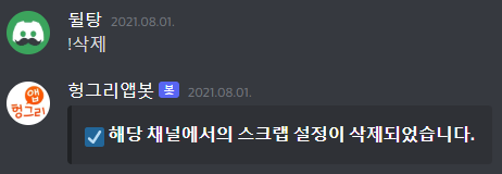 무슨 채널에 어떤 헝그리앱 게시판의 알림을 설정했는지 헷갈리면 !확인 명령어를 쓰면 됩니다. !확인 명령어를 쓰면 게시판 ID와 알림 받는 키워드, 마지막 게시물 번호가 뜨게 됩니다.
