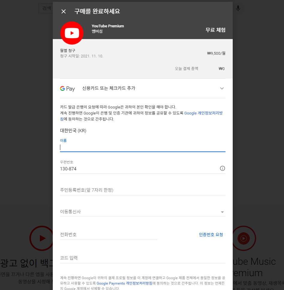 결제창이 뜨고, 여기 카드번호와 기타 정보들을 입력하면 11월까지 유튜브 프리미엄이 가능합니다! 해외 결제가 가능한 체크카드가 없으신 분은 휴대폰으로 창을 열어서 결제수단 등록을 추천드려요. https://www.youtube.com/redeem 이 링크로 들어가서 다시 아까처럼 코드를 입력하고 결제창으로 가시면 됩니다!