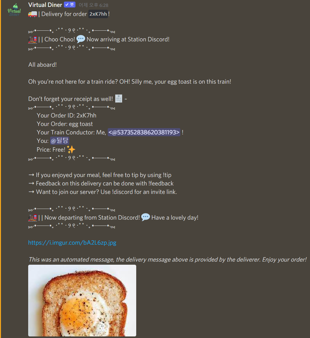 Virtual Diner는 가상으로 음식을 주문하고 받는 컨셉의 봇입니다! 음식이 온다하고 사실 사진 한 장이 오는 것이지만, 심심풀이로 해볼 만합니다.